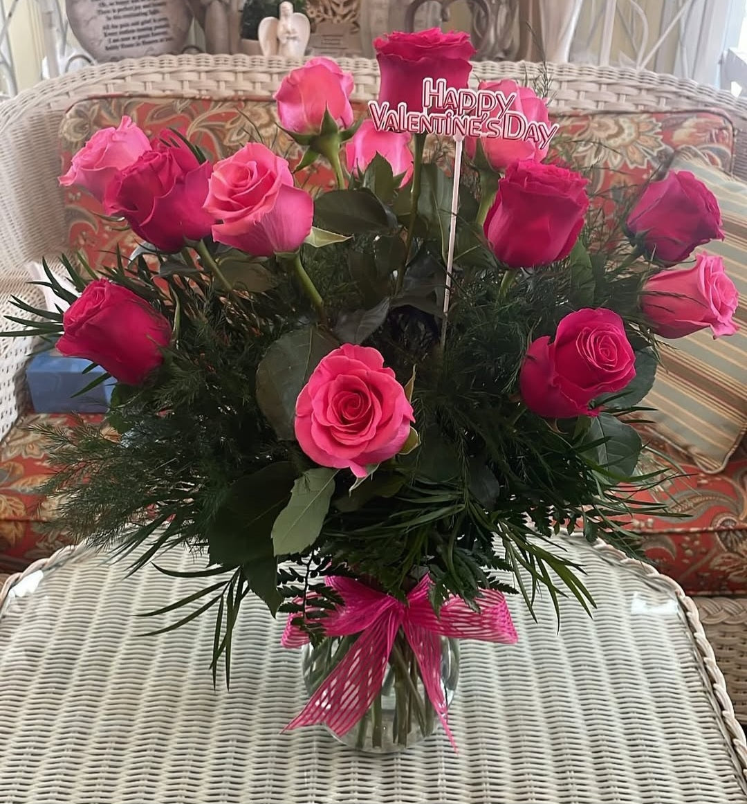 Brighten someone's day with this stunning Valentine's Day bouquet featuring a dozen vibrant pink roses artfully arranged with lush greenery. The fresh blooms are displayed in a clear glass vase, tied with a charming pink ribbon for an extra touch of elegance. A festive "Happy Valentine's Day" pick adds a celebratory flair, making it the perfect gift for expressing love and appreciation.